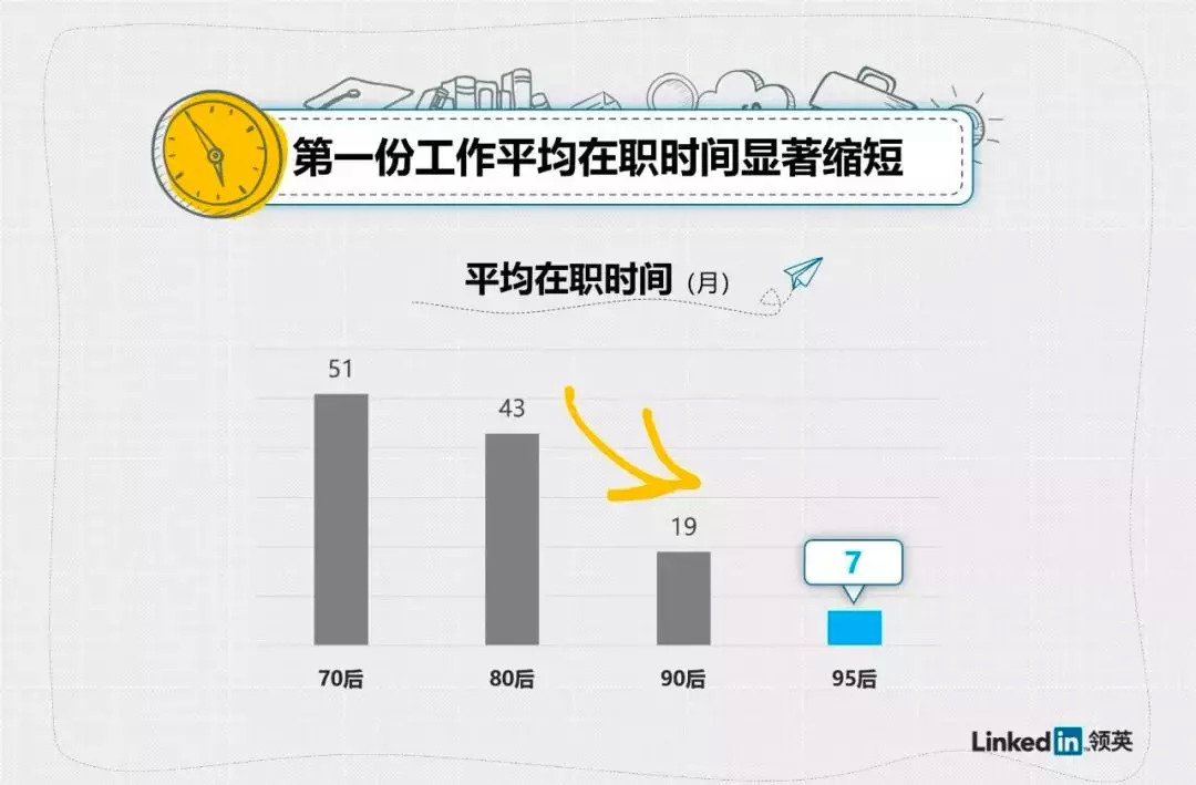 LinkedIn领英发布的《第一份工作趋势洞察》显示,70后的第一份工作超过4年才换,80后3年半,90后直接断崖式下降,95后更是仅仅在职7个月就选择了辞职。