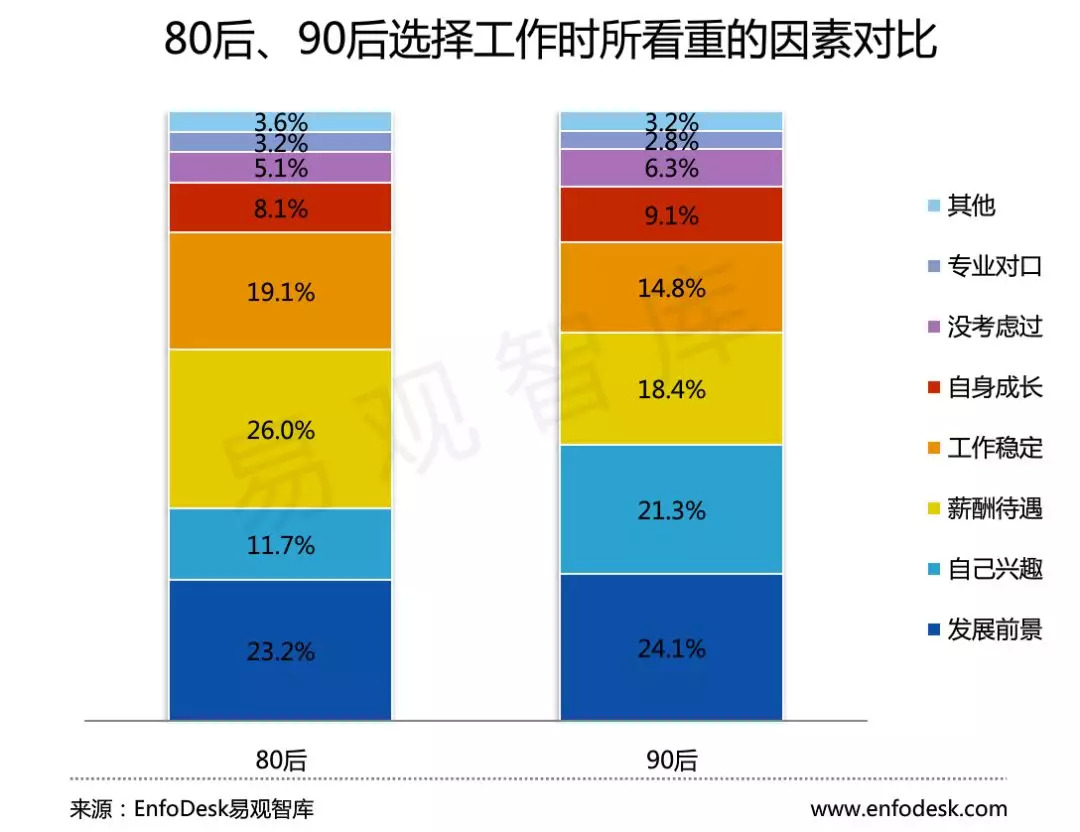 根据《中国90后青年调查报告》,在选择工作时,自我兴趣这一因素在90后中占比21%,而在80后中则仅有12%。