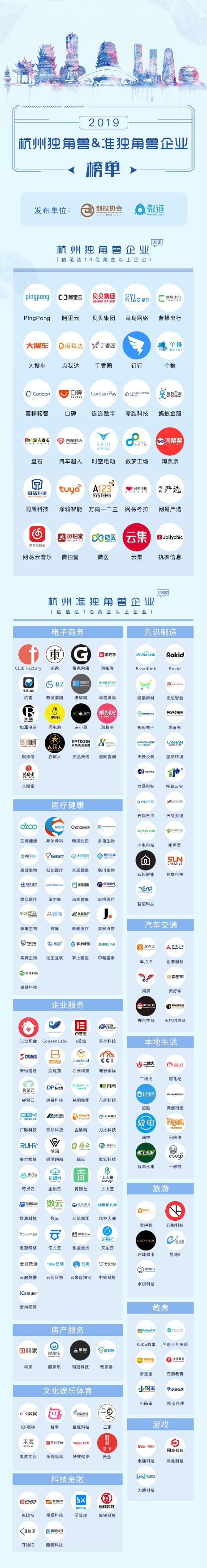 榜单统计,截至2019年2月28日,杭州共有独角兽30家,准独角兽138家,所有企业总估值超3300亿美元,有12家企业成功晋级独角兽队伍,67家企业晋级准独角兽(估值一亿美金以上企业)队伍。