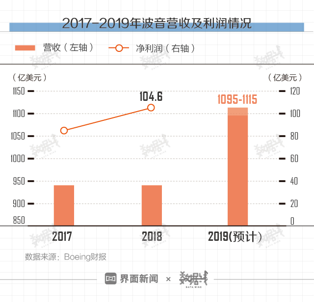 2017年737 MAX达成首次交付,随后的2018年波音公司盈利增长显著。据波音财报,当年,波音总营收共计1011.27亿美元,净利润达到104.6亿美元,比前一年增长了20.02亿美元。同时,财报预计2019年波音将获得1095亿-1115亿美元营收。