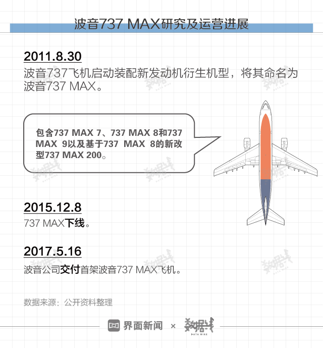 据界面数据(公众号ID:shujuxian_kuaikan)梳理,波音737 MAX飞机的研发运营进程可追溯至2011年8月。在此之后,2015年12月波音737 MAX正式下线,并于2017年5月16日,完成首架交付。