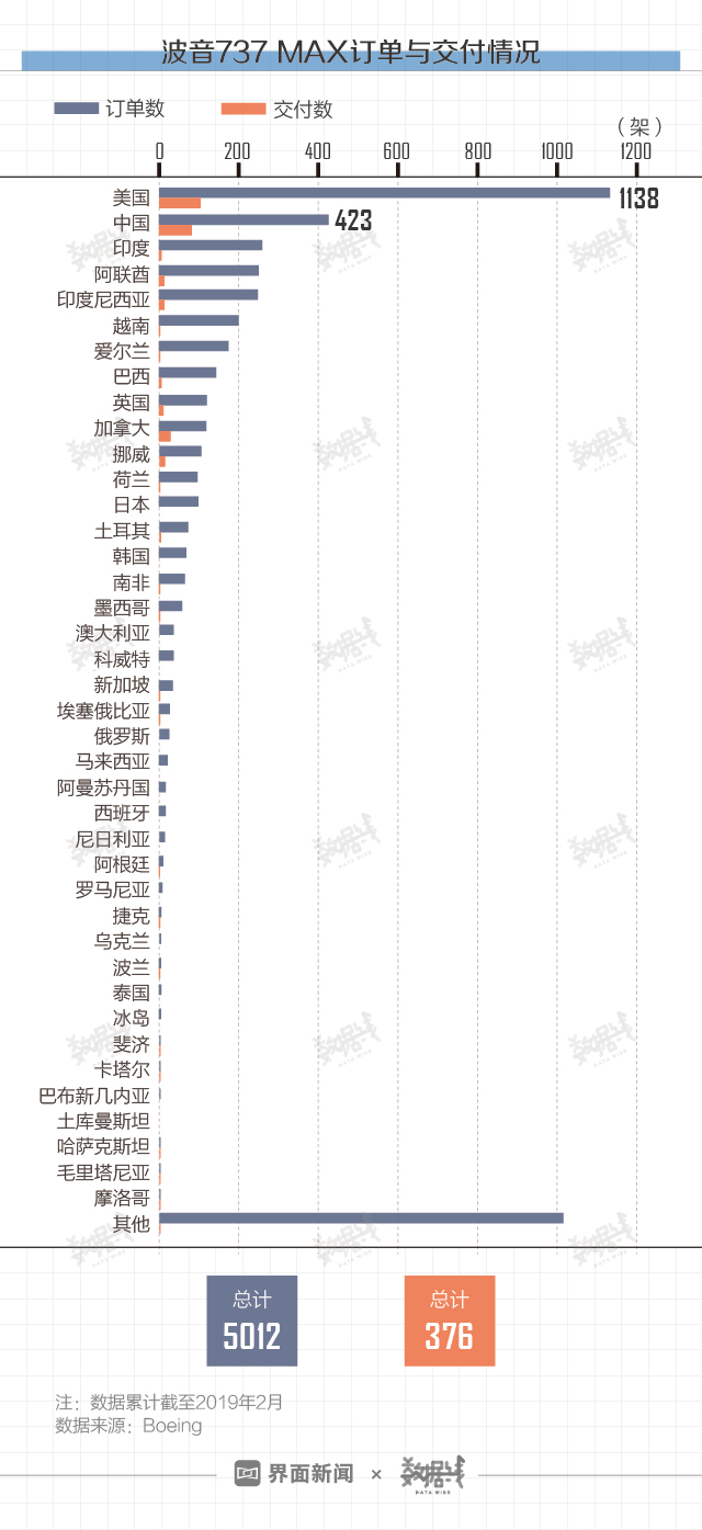 界面数据(公众号ID:shujuxian_kuaikan)整理波音官网订单后发现,截至2019年2月,约40个国家的77家公司订购了波音737 MAX飞机,总量达5012架。其中美国的订购量最多,共计1138架,中国紧随其后,共计423架。