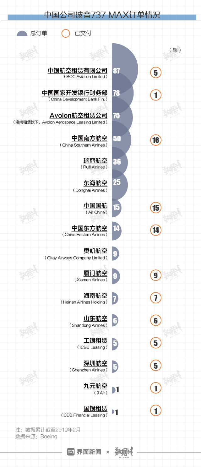 从中国公司订单情况来看,423架737 MAX订单中,已有85架完成交付。其中,中国南方航空公司的交付量最高,共计16架。