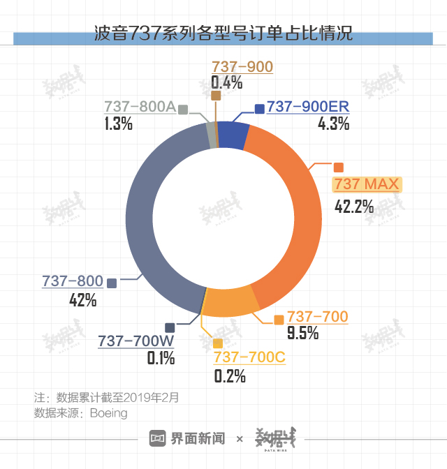 据波音官网数据,截至2019年2月,737系列型号的订单总数约1.19万架。其中737 MAX的订单占比达42.2%,在737系列型号的总订单数中居于首位。