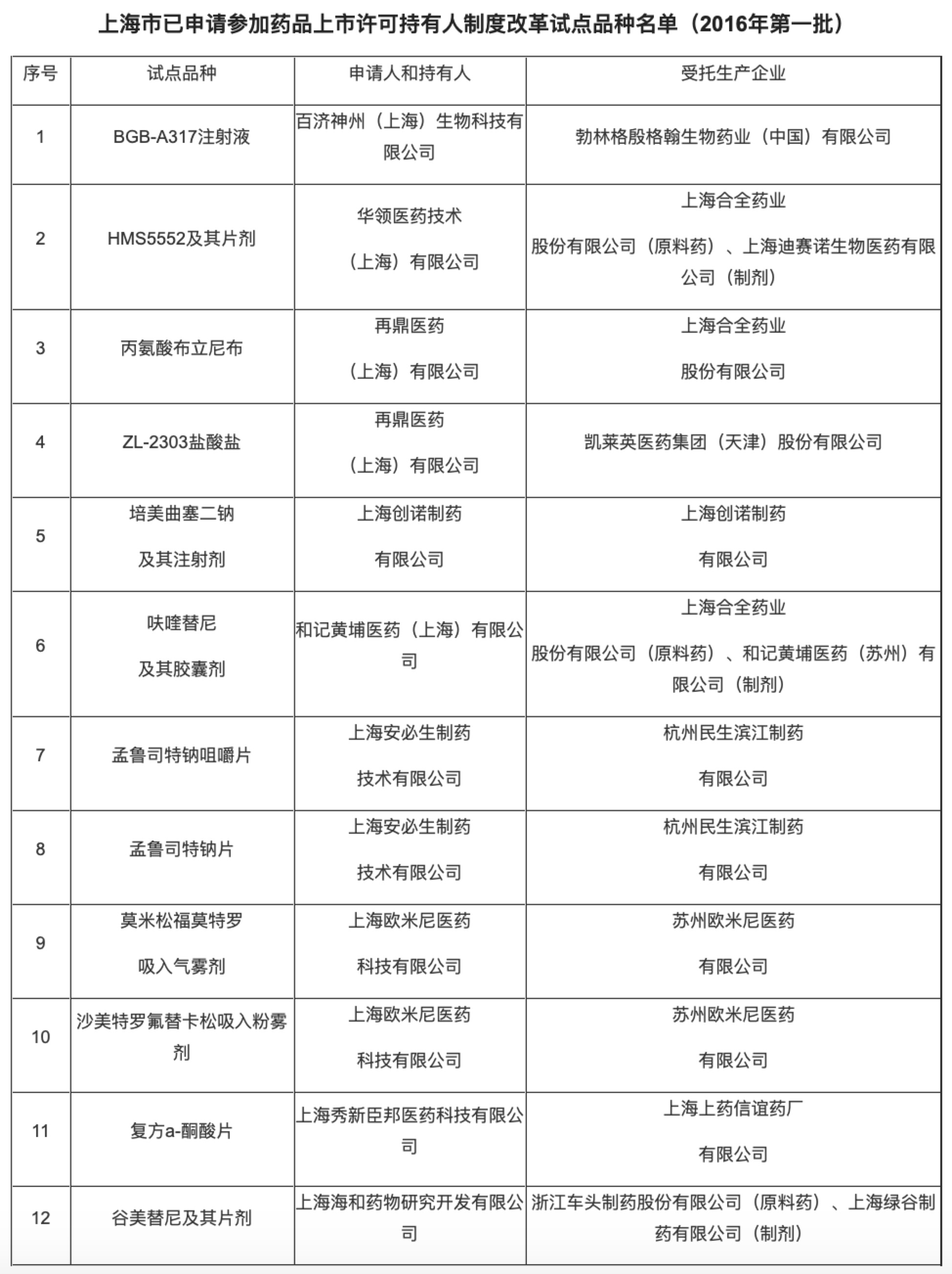 同年10月,上海公布首批试点品种名单。9家药物研发机构、11家药品生产企业递交了12个品种参加药品上市许可持有人制度改革试点的申请资料。其中,和记黄埔医药研发的呋喹替尼胶囊进入上海市食药监局MAH制度首批试点品种名单。