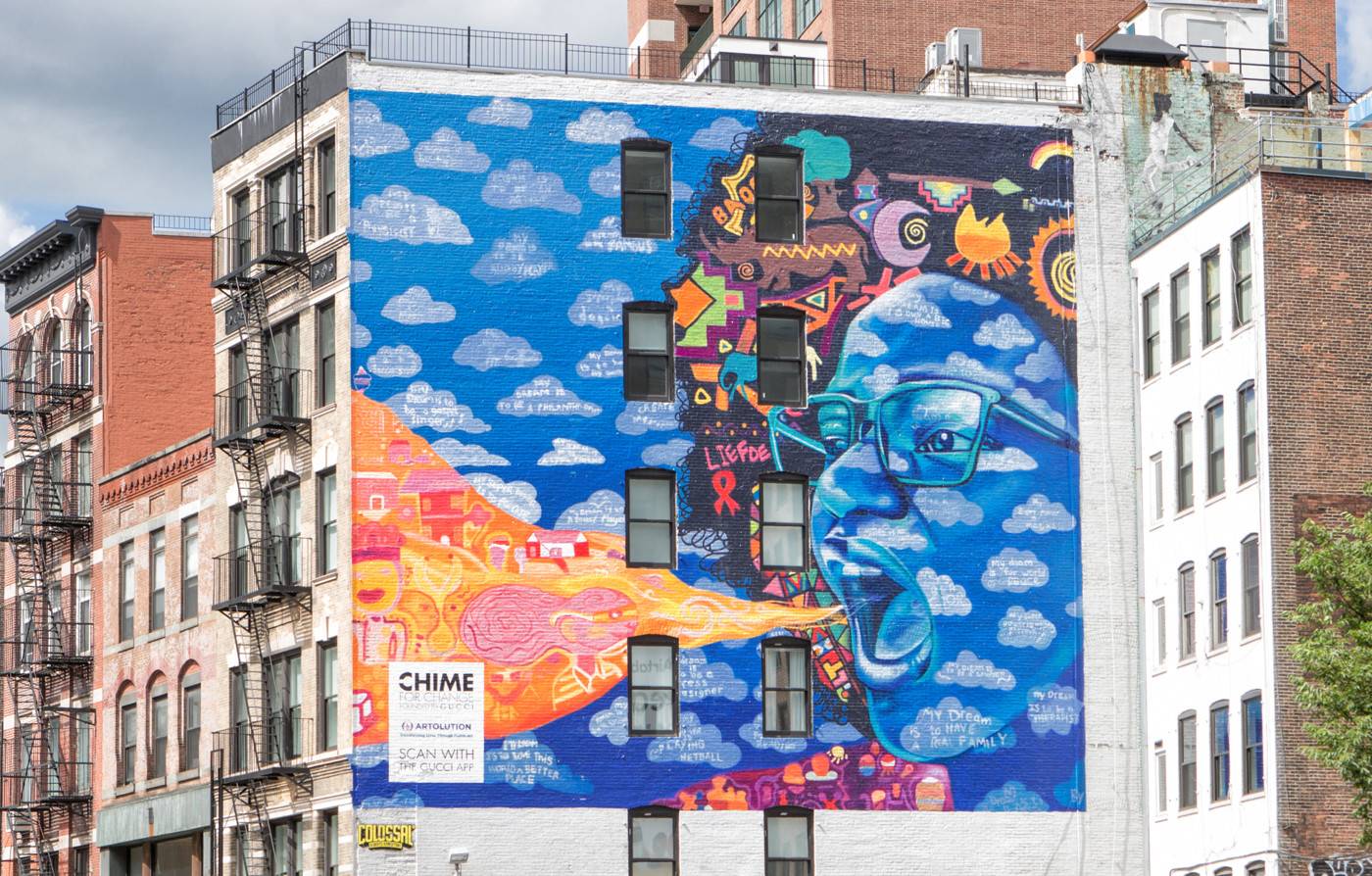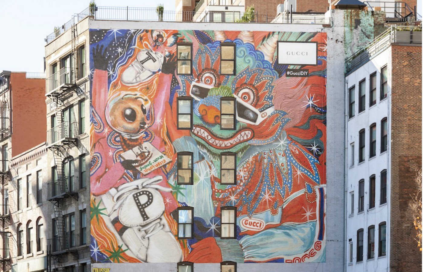 在这点上,Gucci已颇有心得体会。它从2017年起就开始用建筑外墙作画布,与全球各地的插画艺术家合作,开展“艺术墙”计划。在这个计划中,艺术家们画的内容很多时候并不与Gucci的产品直接相关,但是却从品牌推广层面做了努力。而这样的内容也更容易引起传播。毕竟当代消费者都对广告“过敏”——能在社交网络上分享一幅画,显然比分享一则广告看起来“高明”。