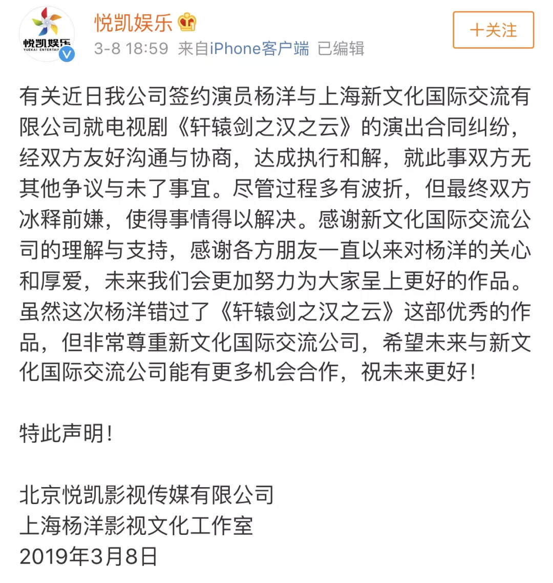 首先,事件发生时,需回应快速有力,避免无理取闹。3月4日杨洋被法院列入被执行人名单,7日登上微博热搜,杨洋方表示已提出执行异议,8日悦凯娱乐宣布双方和解,整个事件过程中杨洋未公开发言,事件却得以雷霆之势迅速处理。