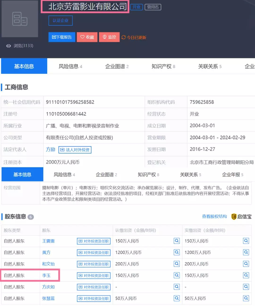 二是深度绑定导演的影视公司。比如北京劳雷影业有限公司除了是《家在水草丰茂的地方》《百鸟朝凤》等文艺片的出品方,公司更多次参与导演李玉的《苹果》《红颜》《观音山》等文艺作品,同时李玉也是这家公司的股东,不难看出二者密切的关系。