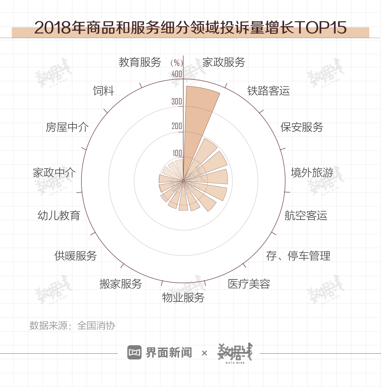 在细分领域中,2018年家政服务成为投诉新热点,其投诉量较2017年暴增386.61%。此外,铁路、保安、境外游、航空、停车、医美等领域投诉量增长也在100%以上。