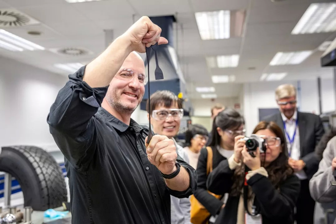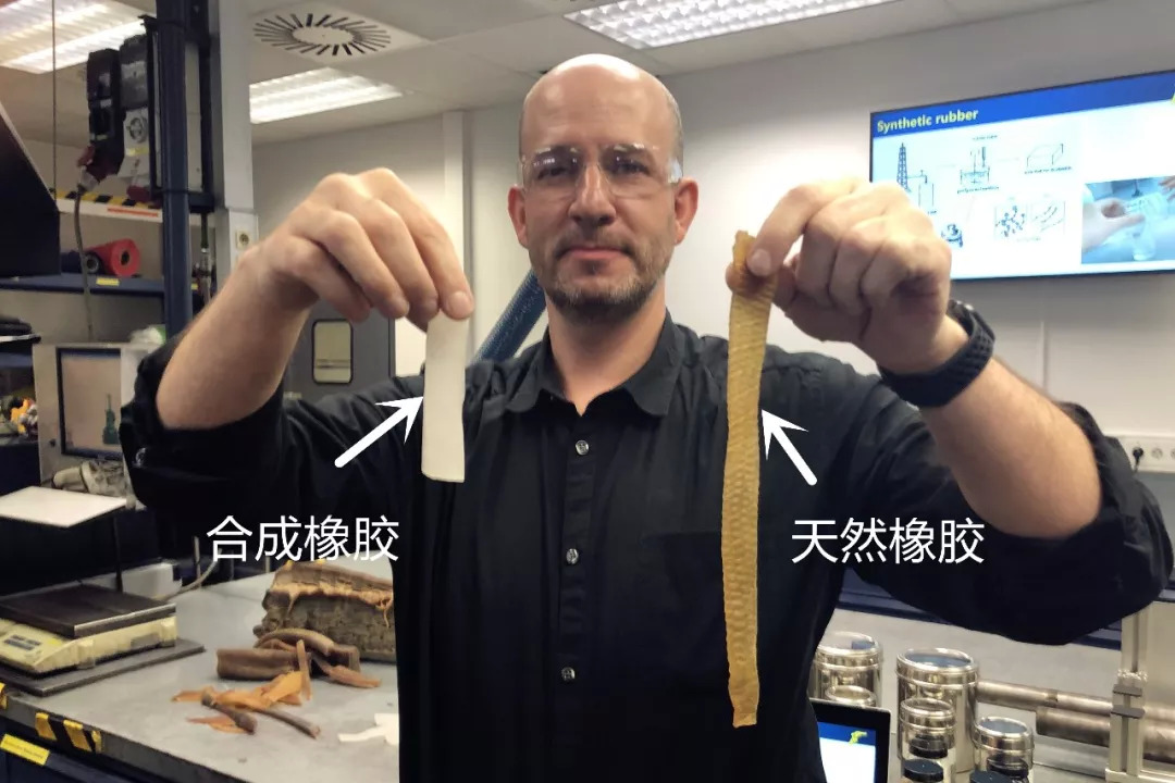 成型后的轮胎接下来就到了最后一道程序“进烤箱”,成型后的轮胎并没有胎面花纹胎圈外凸,并且橡胶强度也不如成品轮胎。在固特异卢森堡研发中心,工程师就给泰哥演示了一下硫化前的生胶和硫化后橡胶拉伸效果对比。