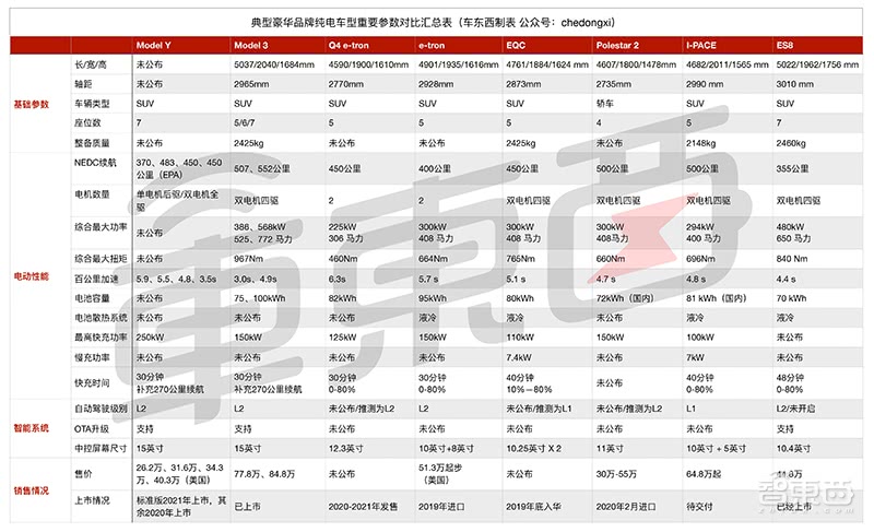 下表为特斯拉家族车型对比表,Model Y目前只有更为贴近实际的EPA标准续航里程参数,其他车型为NEDC续航,NEDC续航要比EPA续航更高。
