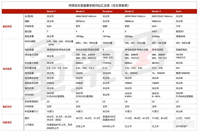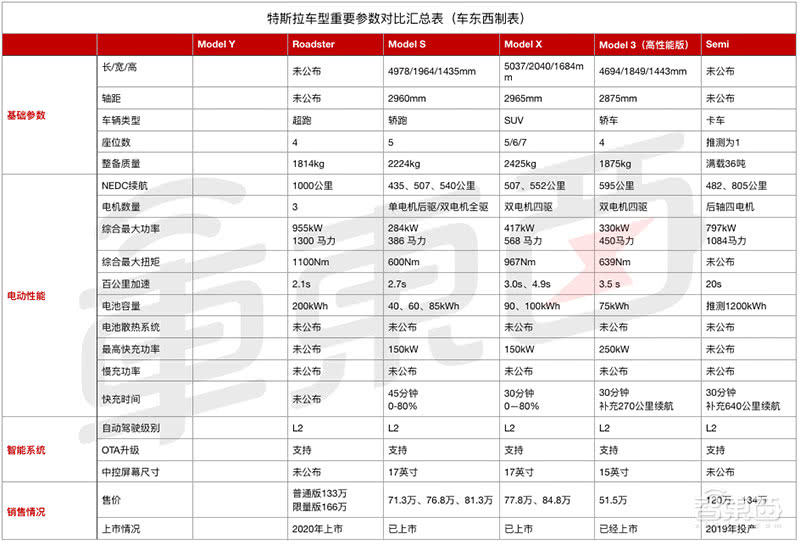 特斯拉已发布车型参数对比