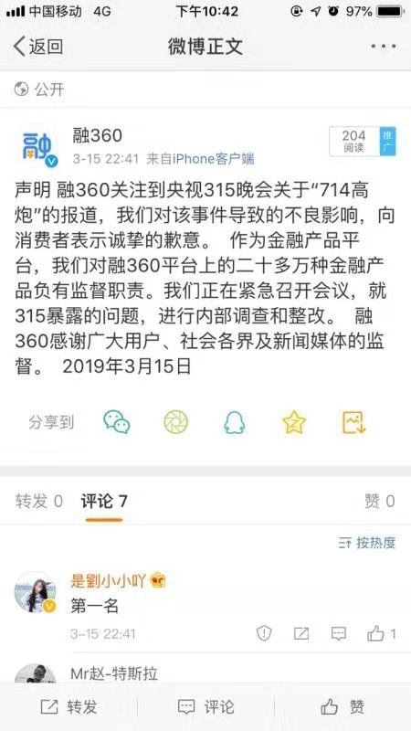 融360官方发表声明称,关注到央视315晚会关于“714高炮”的报道,对该事件导致的不良影响,向消费者表示诚挚的歉意。