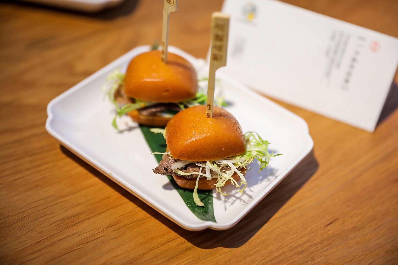 蔡澜则推出了款一口和牛汉堡,将小馒头炸得金黄脆香,夹入和牛肉和青瓜蔬果,摆在细长的芭蕉叶上——比起吃,你的第一反应可能是拍照。