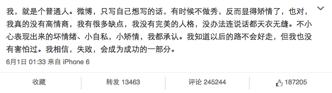 6月1日凌晨,张馨予自己在微博上自白,“我知道以后的路不会好走,但我也没有害怕过。我相信,失败,会成为成功的一部分。”
