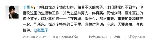 最后,让我们回顾一下,当年2012年李晨公开与张馨予恋情时的微博,如今这条微博,连带着所有有关张馨予的内容,都从李晨的微博上消失了。