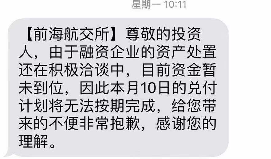 然而,上述投资者对界面新闻记者表示,前海航交所只按照方案兑付了两期,2018年9月、10月都是如期足额兑付,从当年11月开始就再也没有按照规定兑付的金额以及日期返还资金。
