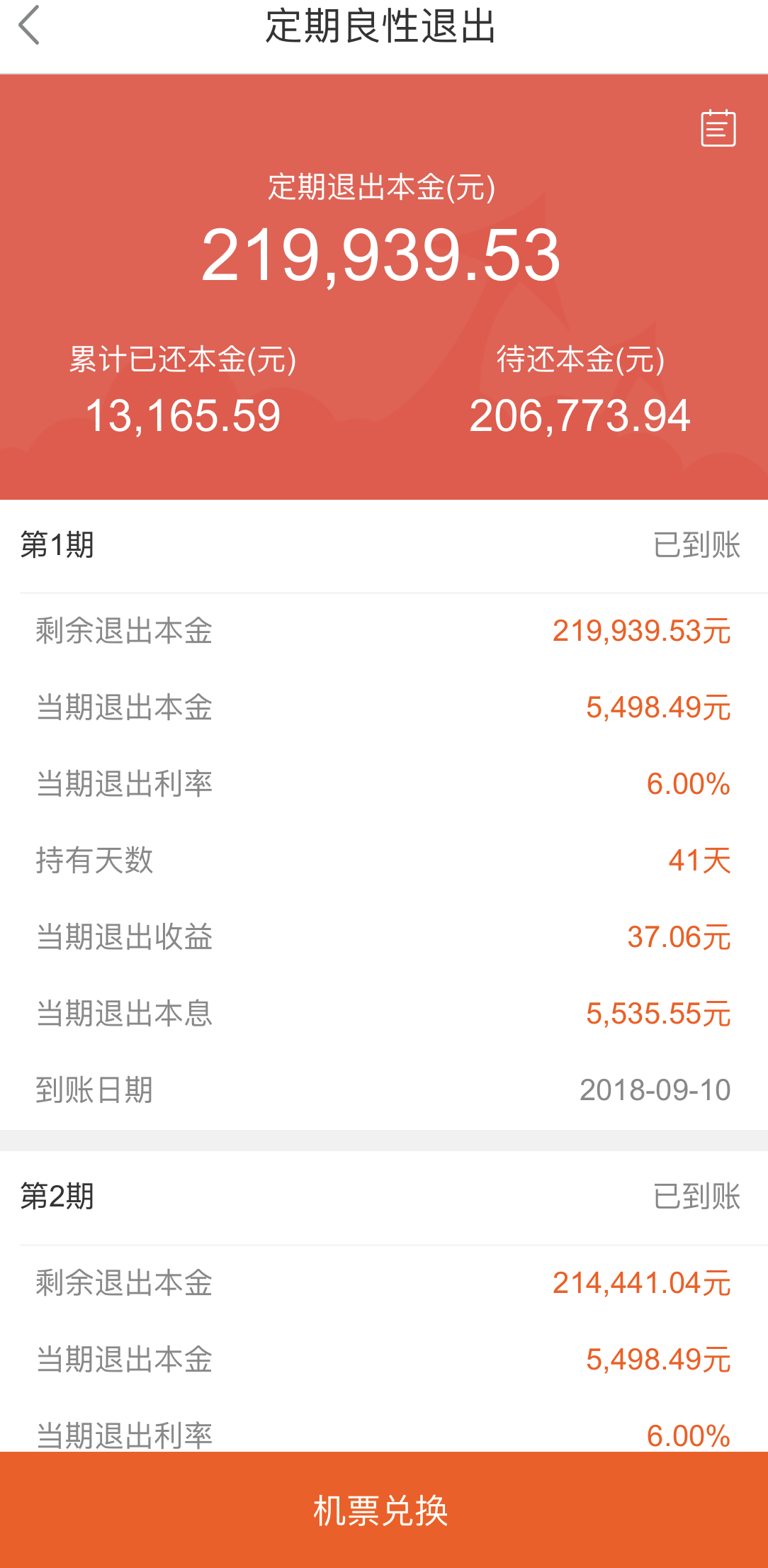 该投资者提供的前海航交所定期良性退出兑付记录显示,其共计买入了21.99万元的前海航交所产品,2018年9月10日与10月10日,前海航交所按照上述退出方案足额按时返还了其兑付金额。