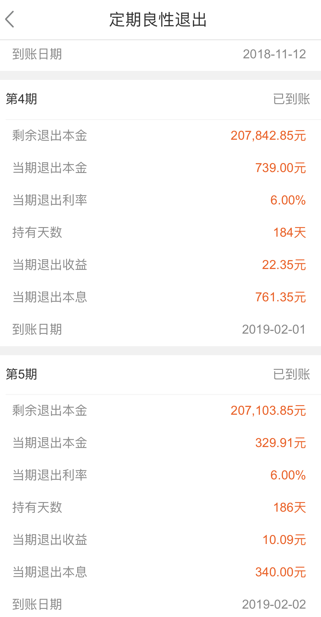 具体而言,在第1个月至第6个月期间,每月兑付退出本金的2.5%以及当期收益;第7个月至第12个月期间,每月兑付退出本金的3%以及当期收益;第13个月至18个月期间,每月兑付退出本金的4%以及当期收益;第19个月至23个月期间,每月兑付退出本金的7%以及当期收益;最后一个月,兑付退出本金8%以及当期收益。自2018年9月起兑付第一期,每月10日为兑付日。