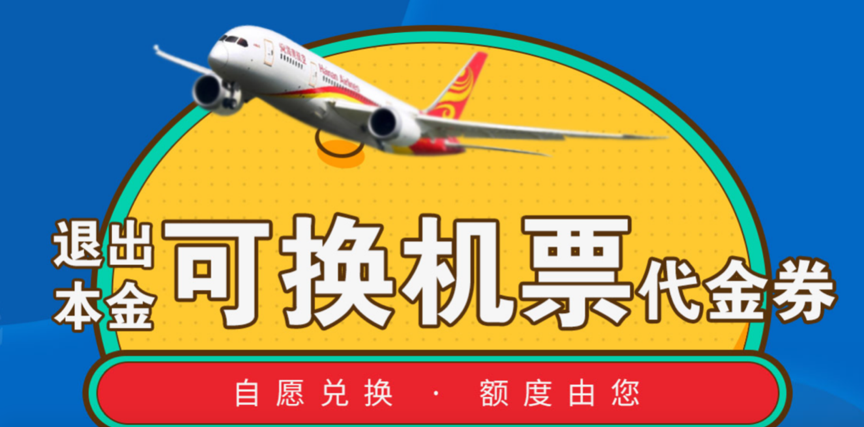 除良性退出方案外,前海航交所还提出“本金兑换机票代金券”的方案,投资人可将剩余定期、满斗金(前海航交所一活期产品)、活期产品退出本金全部或部分等值兑换成海南航空机票代金券。在其宣传页面上,写着“自愿兑换,额度由您”字样。
