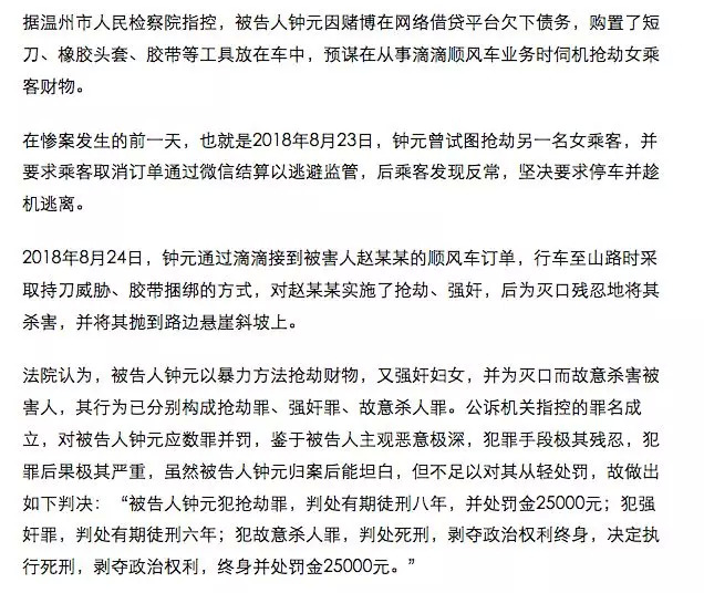 2月1日上午,温州市中级人民法院一审以故意杀人罪、强奸罪、抢劫罪,判决顺风车司机钟元死刑,剥夺政治权利终身。
