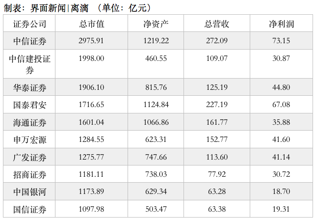 虽然总市值排名第二,但中信建投净资产仅为460.55亿元,大幅低于其他券商,在总市值前十大券商中垫底。