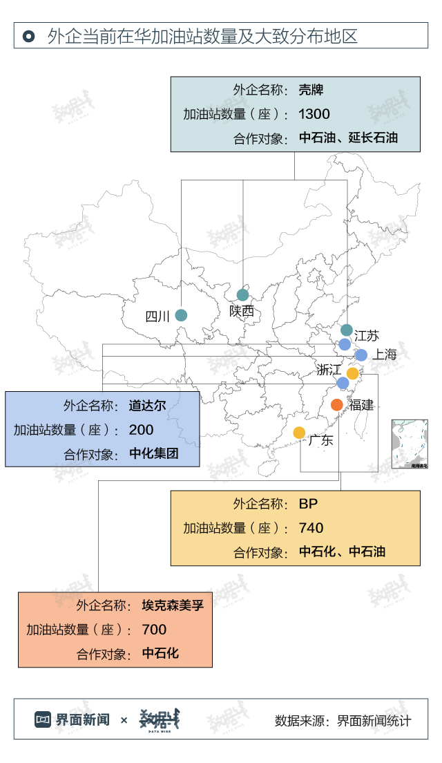 其中,壳牌拥有1300座,主要与中石油、陕西延长石油集团等合作,大多分布在陕西、四川和江苏等地;BP拥有740座,分别与中石化、中石油合作,主要分布于广东和浙江;埃克森美孚700多座,以和中石化合作为主,集中分布在福建;道达尔200多座,主要和中化集团合作,燃料油业务分布于北京、天津、河北、辽宁,成品油业务分布于江苏、浙江和上海。