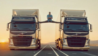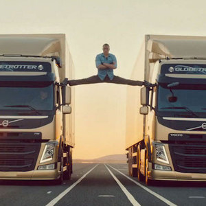 在这则展现沃尔沃卡车稳定性的广告中,尚格·云顿在有些晃动的镜头中缓缓睁开双眼,随着焦距越来越远,人们这才发现他正站在两辆匀速倒退行驶的沃尔沃卡车的侧视镜上,而之后卡车间距逐渐拉大,尚格·云顿依旧维持着站立动作,直至在行驶的卡车之间形成一个“一字马”。