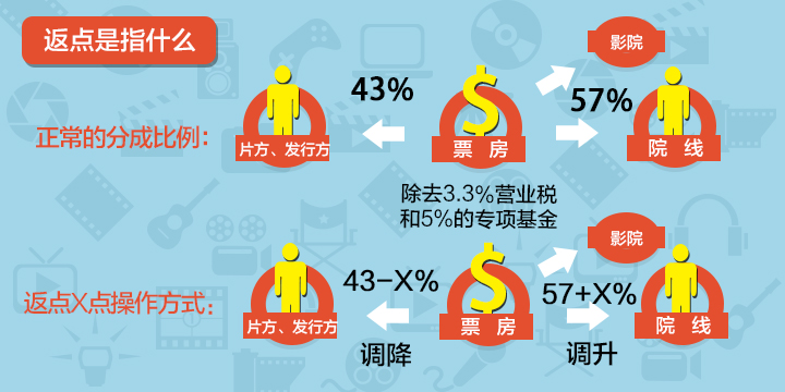 在中国现在的分账体系中,片方/发行方和影院分别分得43%、57%的票房。但也有不少片方,为了使影院在排片时给自己更多的场次,而自动让利分成点数,将本该属于自己的票房分成返还给影院——这种方式被称为返点。