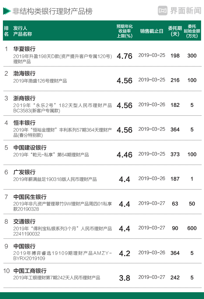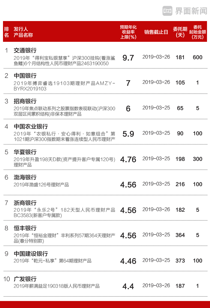 来看看本周有哪些可以挑选的银行理财产品,本周,18家国有商业银行和股份制商业银行全国范围发售针对个人的人民币理财产品162只,界面新闻从每家筛选了收益率最高、最值得关注的理财产品,共10只。