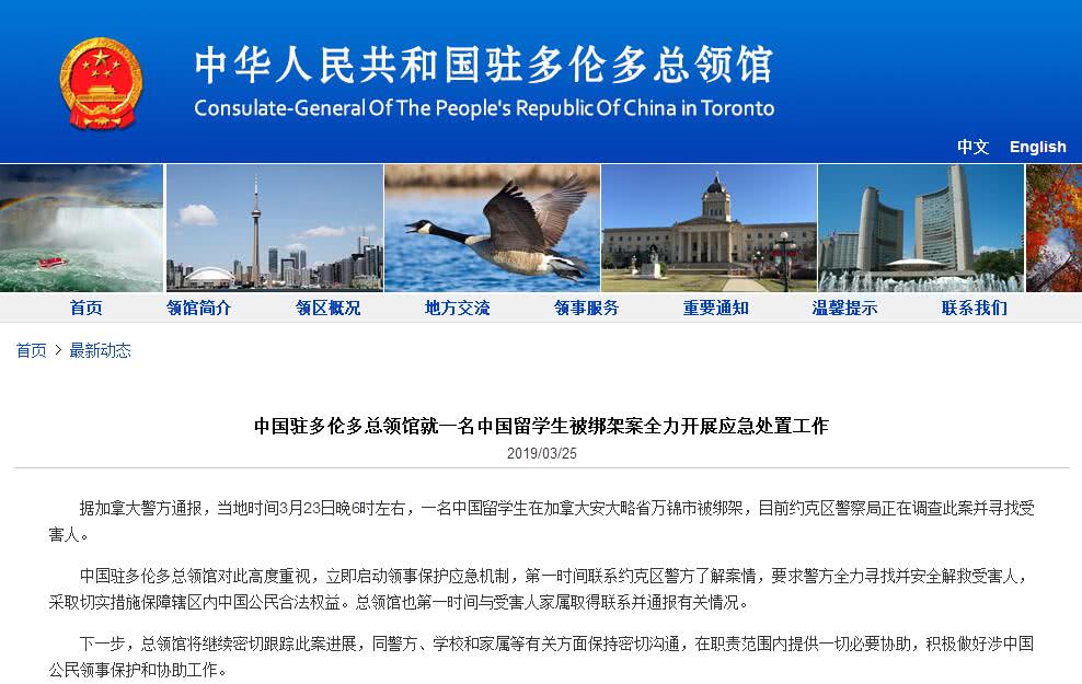 总领馆表示,据加拿大警方通报,当地时间3月23日晚6时左右,一名中国留学生在加拿大安大略省万锦市被绑架,目前约克区警察局正在调查此案并寻找受害人。