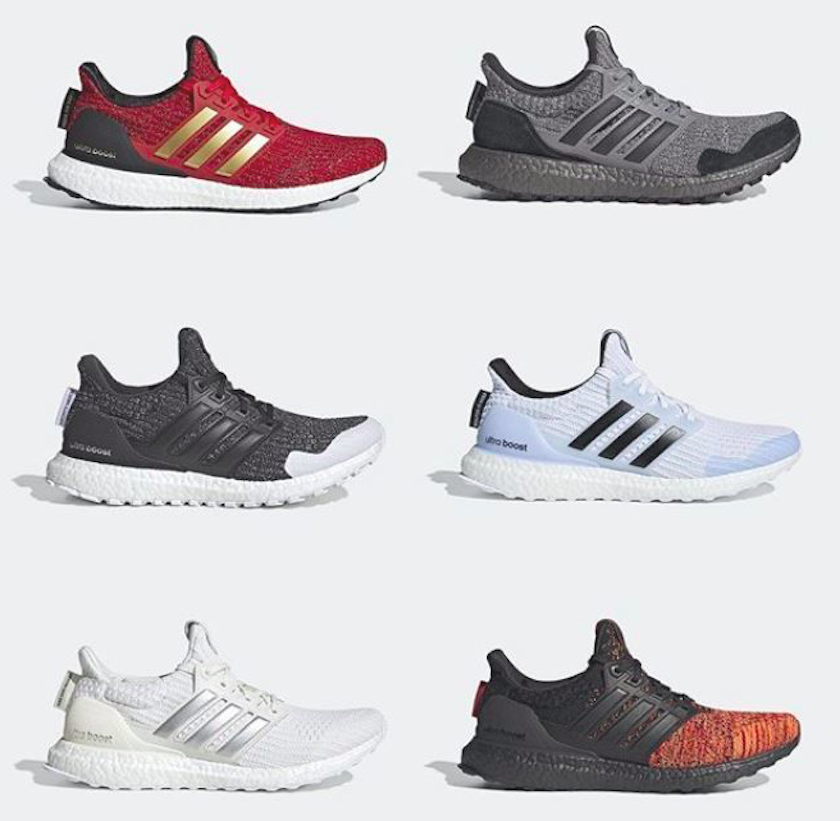 今年4月14日,《权力的游戏》将上映最终季,而这个三次荣获艾美奖最佳剧集、获创纪录收视率的大热IP,也成为了阿迪达斯合作的对象。阿迪达斯旗下顶级缓震跑鞋Ultra Boost 与《权力的游戏》推出了6款主题联名配色,并于3月22日至4月14日间限时发售,每双售价约为人民币1133元。