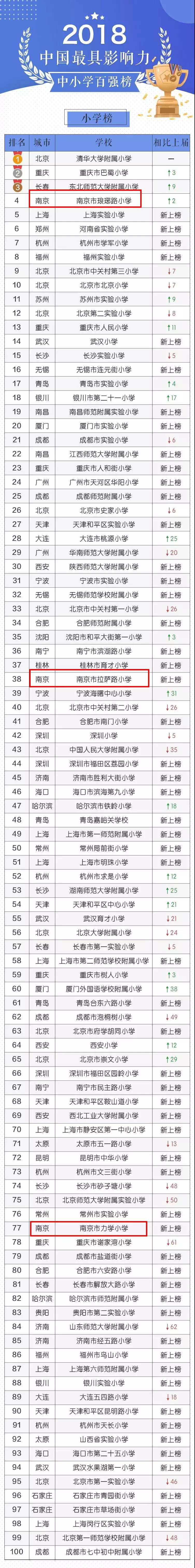 在全国的百强小学中,南京上榜三名,分别是拉力琅三所小学。琅琊路小学排名第4,拉萨路小学排名38,力学小学排名77。