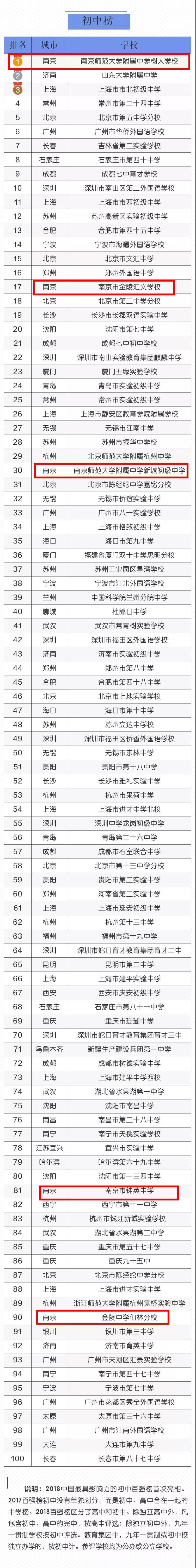 此次入围全国初中百强榜的分别是南京师范大学附属中学树人学校、南京市金陵汇文学校、南京师范大学附属中学新城初级中学、南京市钟英中学以及金陵中学仙林分校。