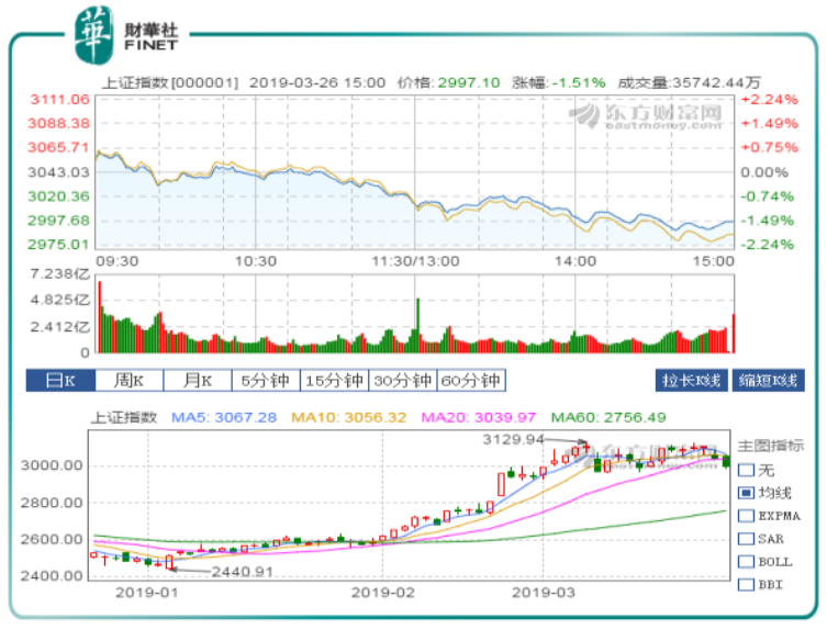 3月26日,受到外围市场的影响,沪深两市股指早盘小幅高开,但随后快速回落,受军工股持续杀跌的拖累,三大股指全线走低,上午临收盘前出现一波跳水行情,悉数翻绿;午后,A股指数持续单边下挫,跌幅扩大,沪指午后在金融股打压下失守3000点整数关口跌破20日线,创业板指大跌逾2%,个股一片惨绿,两市近30股跌停。整体而言,今日市场热点匮乏,前期热门板块领跌,行业板块几乎全线受挫,中小创个股纷纷下跌,跌停家数增多,市场人气极度低迷,避险情绪显著上升。