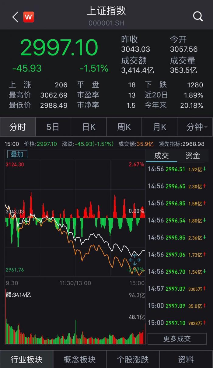 当日开盘后,两市一路下挫,多头几无任何挣扎,午后跌幅更是不断扩大,最终沪指跌破3000点收2997.1点,创业板跌逾2%,两市近3000只个股下跌。