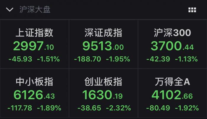 3月26日,各大指数单边下行,上证指数大跌1.51%,失守3000点,报收2997.1点,跌45.93点;深证成指收跌1.95%;创业板指收跌2.32%。