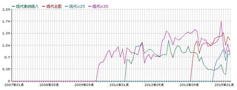 在某种程度上,北京现代是在看齐大众和通用,但麻烦的是,现代并不是一个如同大众、通用这样强势的汽车品牌。通过上面的曲线,我们可以很清楚的看到,无论是名图,还是ix25,它们在补齐北京现代产品线的同时,也在侵蚀索纳塔8和ix35的市场份额,也就是说,双子策略有鲜明的内斗痕迹。