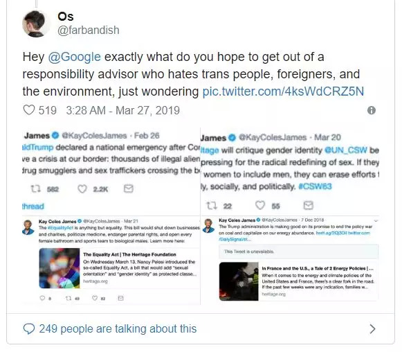 谷歌方面没有立即就James的反LBGTQ的立场和委员会成员的选拔过程发表评论。