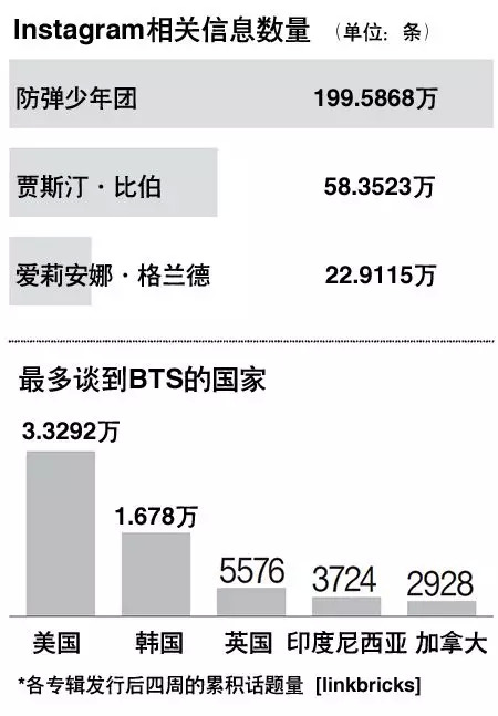 同时,在Instagram影响力分析中,防弹少年团也排在爱莉安娜·格兰德、贾斯汀·比伯等顶级明星之前。