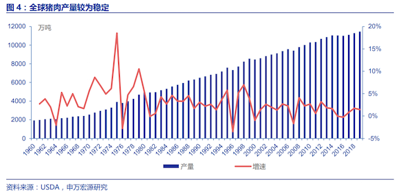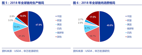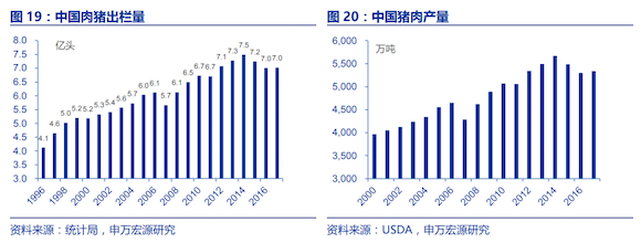 中国是最大的猪肉生产国,也是最大的猪肉消费国。2017年中国生猪出栏头数约为7亿头(该数字与USDA的统计数据差异不大),国内猪肉消费量约为5400万吨,生猪及猪肉产销量约占全球的一半,居世界首位。