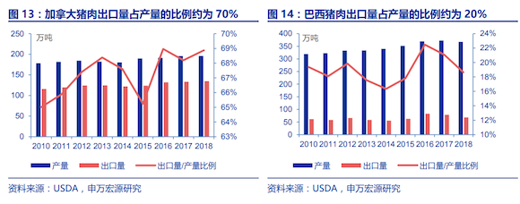 出口国分析:主要猪肉出口国基本是主产国,欧盟、美国、巴西的出口占产量的比例13%-23%之间,加拿大出口比例较大(70%的猪肉用于出口,自用比例较低)。