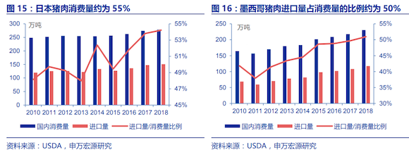 根据USDA预测,2019年欧盟、巴西、加拿大等主要出口国猪肉产量均维持稳定,美国猪肉产量有望增加63万吨。假设进口增量的1/3(约60万吨)来自美国,则美国猪价涨幅将不容小觑(美国瘦肉猪期货1906合约价格已经超过95美分/磅,较近期低点涨幅超过30%)。猪肉国际贸易价格将传导至主要进口国(日本、墨西哥、韩国等),推升该国猪肉价格。