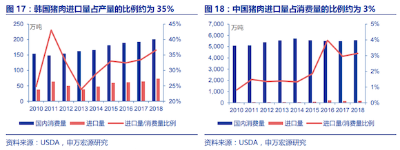 经过前文分析,日本、韩国、墨西哥等国家猪肉消费得到35%-55%依赖进口,且不受国际猪肉价格的影响,是稳定的进口国家,根据USDA预测,2019年这三个国家的进口量约为345万吨(基本与2018年持平),此外还有部分国家有一定量的进口需求,则全球约850万吨的贸易量中可供中国调动的不足400万吨。考虑到2016年中国猪价高峰时进口量为162万吨,增加84万吨(USDA数据,2016年进口量218万吨,增加105万吨),2016年全球猪肉贸易量增加112万吨,增量基本全部由中国贡献。我们认为2019-2020年进口量的高峰最高可能达到300万吨左右,相比2018年增加180万吨。考虑到进口量的增加,国内供需缺口约为630万吨。