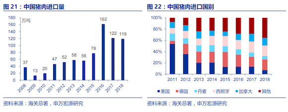 中国是最大的猪肉进口国,但相对国内消费量,进口量占比不足3%。2018年猪肉进口量约为119万吨(2017年121万吨,2016年猪价高峰时进口量为162万吨),猪肉进口量约占中国猪肉消费量的2.2%;生猪进口量仅为0.8万头。