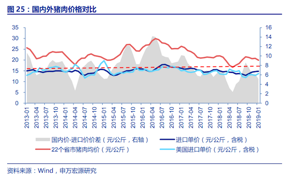 正常情况下,进口猪肉的驱动因素是国内外价差。2019年1月中国进口猪肉单价约为1.77美元/公斤,其中自美国进口猪肉价格约为1.13美元/公斤,折算成人民币含税价是14.79元/公斤、13.70元/公斤(美国进口猪肉自2018年4月、7月两次加征25%关税),国内22个省市猪肉价格19.92元/公斤,价差约为5.13元/公斤,而2013年至今价差的均值约为8元/公斤(以美国猪肉为代表的国际价格最近已经开始上涨,如果按照最新价格测算,几乎不存在价差,但由于预期国内价格将创历史新高,进口有利可图)。