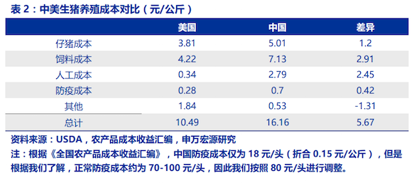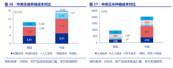 进口猪肉存价差主要原因是中国养殖成本较高,且主要差异来自饲料。以中美为例,2017年中国外购仔猪的养殖成本约为16.16元/公斤,而美国的养殖成本(合同户)仅为10.49元/公斤,其中差异较大的主要是仔猪成本(差异1.20元/公斤)、饲料成本(差异2.91元/公斤)和人工成本(差异2.45元/公斤),中国防疫成本也高于美国。其中仔猪成本与养殖效率有关(如PSY等指标),人工成本与规模化程度有关,饲料成本差异除与料肉比等养殖效率有关外,更重要的原因是中美大宗农产品的价格差异较大。