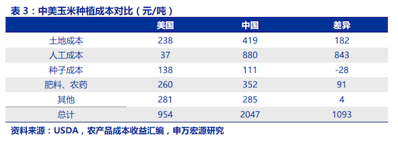 中美大宗农产品种植成本差异较大。2017年中国玉米种植成本约为2047元/吨,而美国种植成本仅为954元/吨,主要差异来自人工成本(差异843元/吨)与土地成本(差异182元/吨),中国肥料、农药等成本高于美国,但种子成本低于美国。