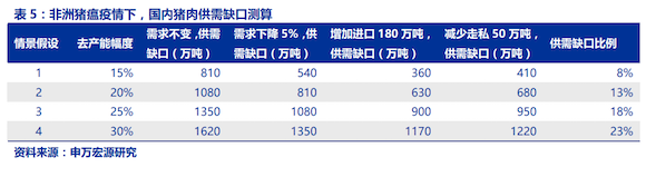 核心结论:2019-2020年增加进口或成定局(最多增加180万吨);但由于越南发生非洲猪瘟疫情,严打走私可能减少部分走私量(预计减少50万吨);供港澳的活猪及猪肉保持稳定。因此我们预计净进口(包括走私)增加约130万吨。假如国内猪肉产量下降15%、20%、25%、30%,消费下降5%,增加的净进口(包括走私)可以补充2%的缺口,则供需缺口分别为8%、13%、18%、23%。在中性假设下,20%左右的供需缺口将使猪价创历史新高。