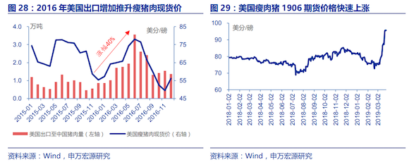 复盘2016年,美国出口量增加11万吨,增量基本都是对中国出口,2016年上半年美国瘦猪肉现货价由55.36美分/磅上涨至77.99美分/磅,涨幅约为40%。由上文论述,中国猪肉进口量可能增加180万吨,根据USDA预测,2019年欧盟、巴西、加拿大等主要出口国猪肉产量均维持稳定,美国猪肉产量有望增加63万吨。假设进口增量的1/3(约60万吨)来自美国,则美国猪价涨幅将不容小觑。目前,美国瘦肉猪期货1906合约价格已经超过95美分/磅,较近期低点涨幅超过30%。